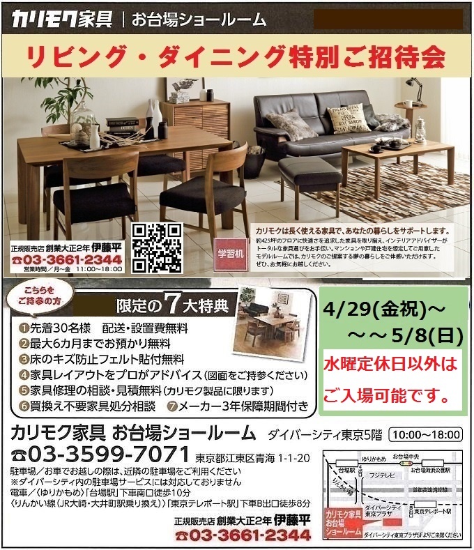 ●カリモク家具販売株式会社では、カリモク家具お台場ショールームにてカリモク家具『ご招待会』 を開催致します。期間中はメーカー展示場ならではの豊富な品揃えで、リビング、ダイニング、ベッド、寝装品等 の商品を【ご体感いただけます】