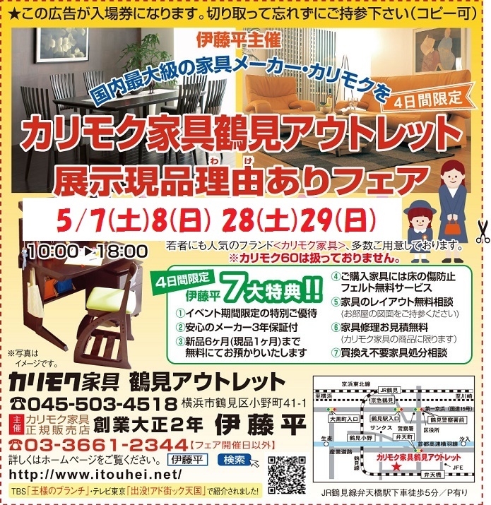 ★5/28(土)29(日)カリモク家具鶴見アウトレット『理由(ワケ)ありフェア!』