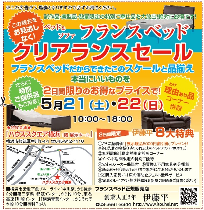 ★5/21(土)22(日)横浜『ベッド&ソファクリアランスセール』